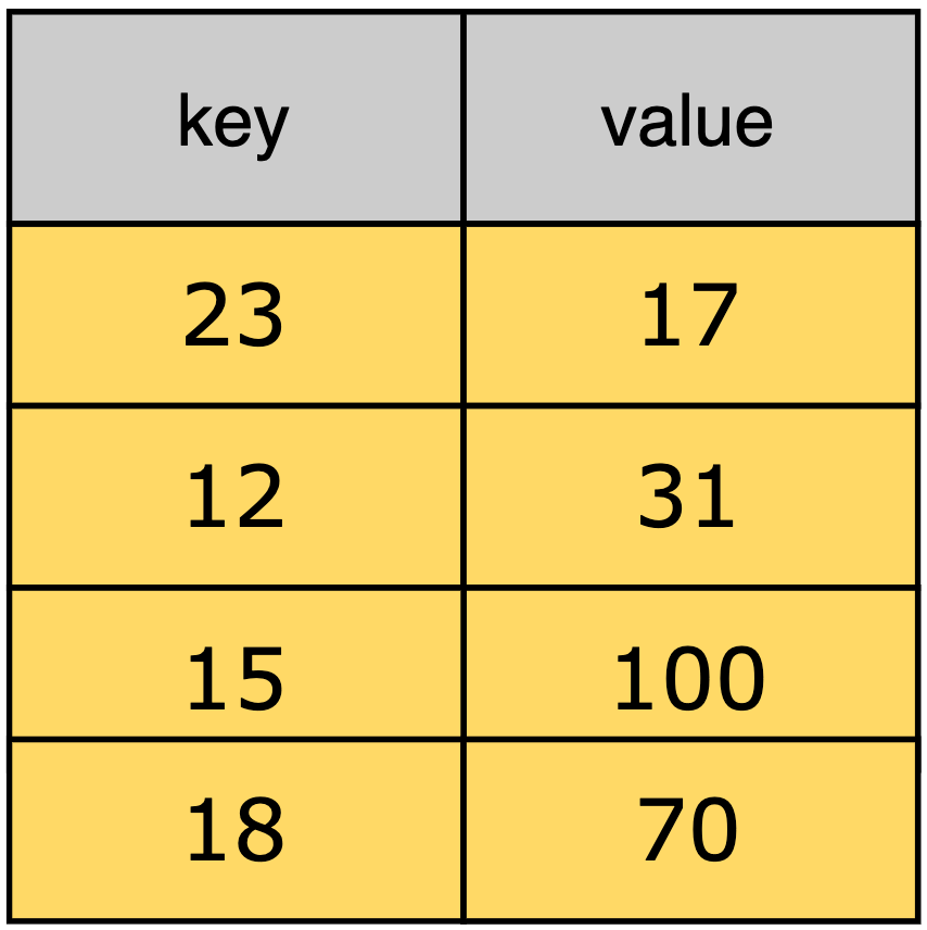 Suppose we have a cache with a capacity of 4. It has the keys shown below. The keys are shown sorted by age - oldest at the top, newest at the bottom. What is the new state of the cache, if we set a new pair with the following inputs?